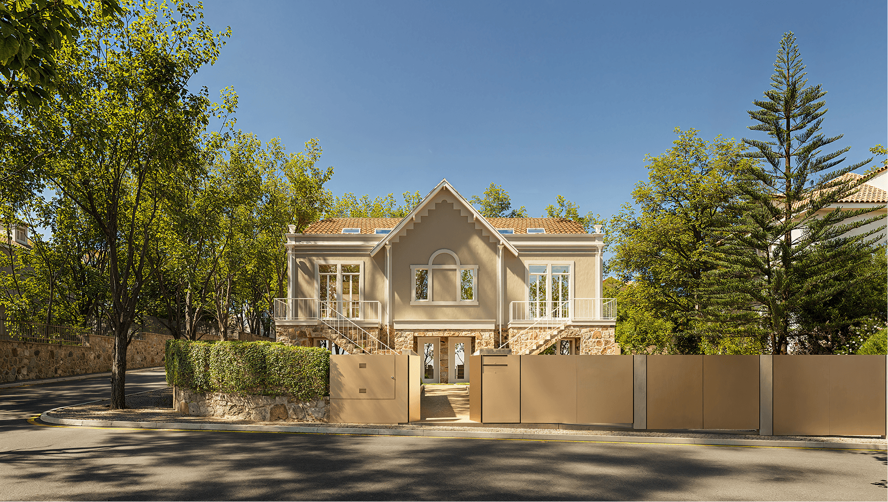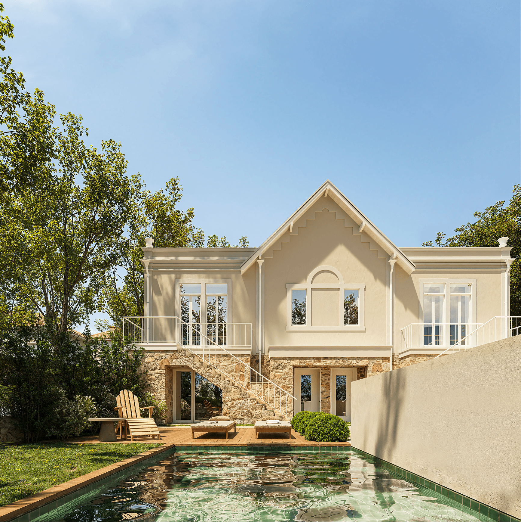 Construído entre entre o final do séc. XIX e o início do séc. XX, o chalet pertence à tradição das casas de veraneio românticas da linha de Cascais. Com traços inspirados nos chalets suíços e ingleses, foi pensado para uma vivência leve, com coberturas inclinadas, pedra rústica e detalhes em madeira.